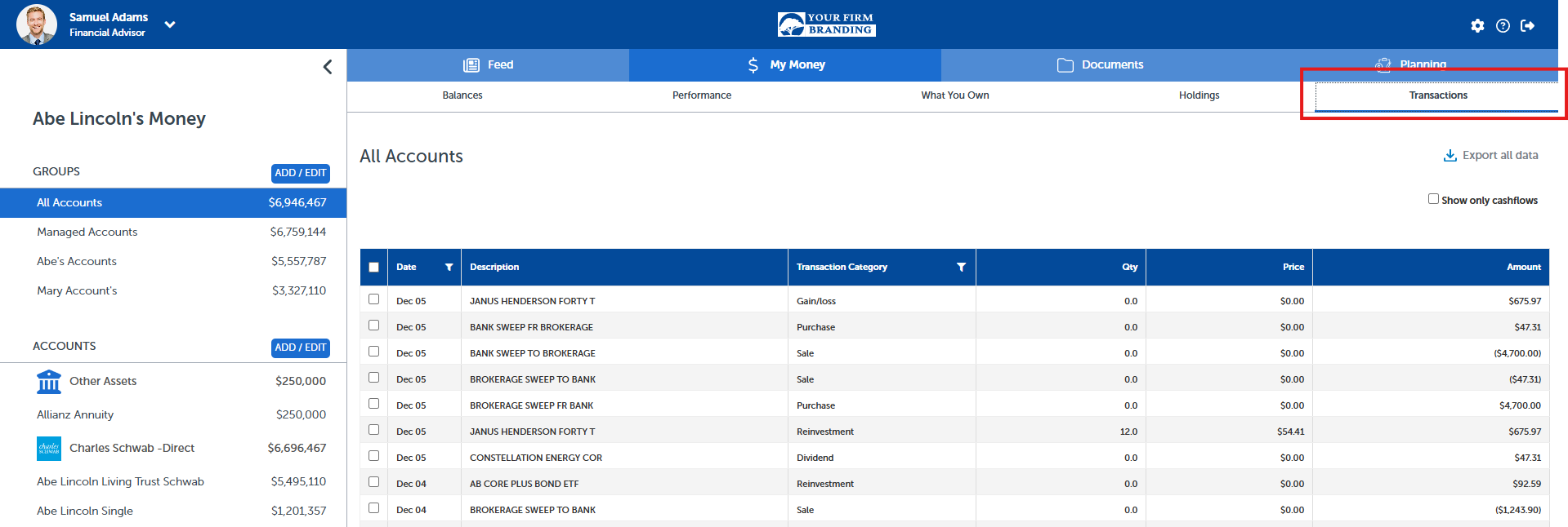 Lastly, you can update the transaction category by selecting the "Transaction Category" column for any given transaction. Note: this can have an impact on performance calculations, double check with your advisor should you believe any to be categorized incorrectly!