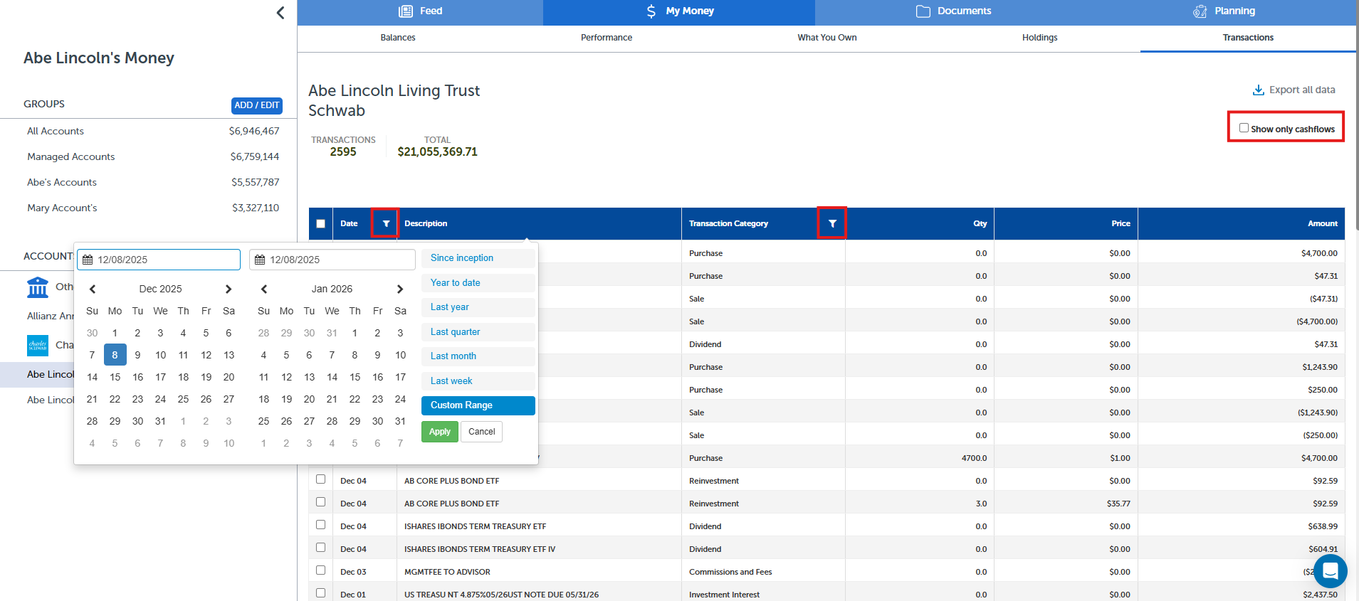 You can also filter transactions by date or category using the respective filter buttons listed at the top of each column. Or, you can filter to only cashflow transactions (deposits, withdrawals, and transfers) using the checkbox in the upper right. Use these to locate the specific transaction(s) you are interested in viewing!